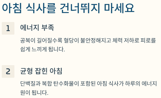 단백질과 복합 탄수화물이 포함된 아침 식사를 권장합니다.